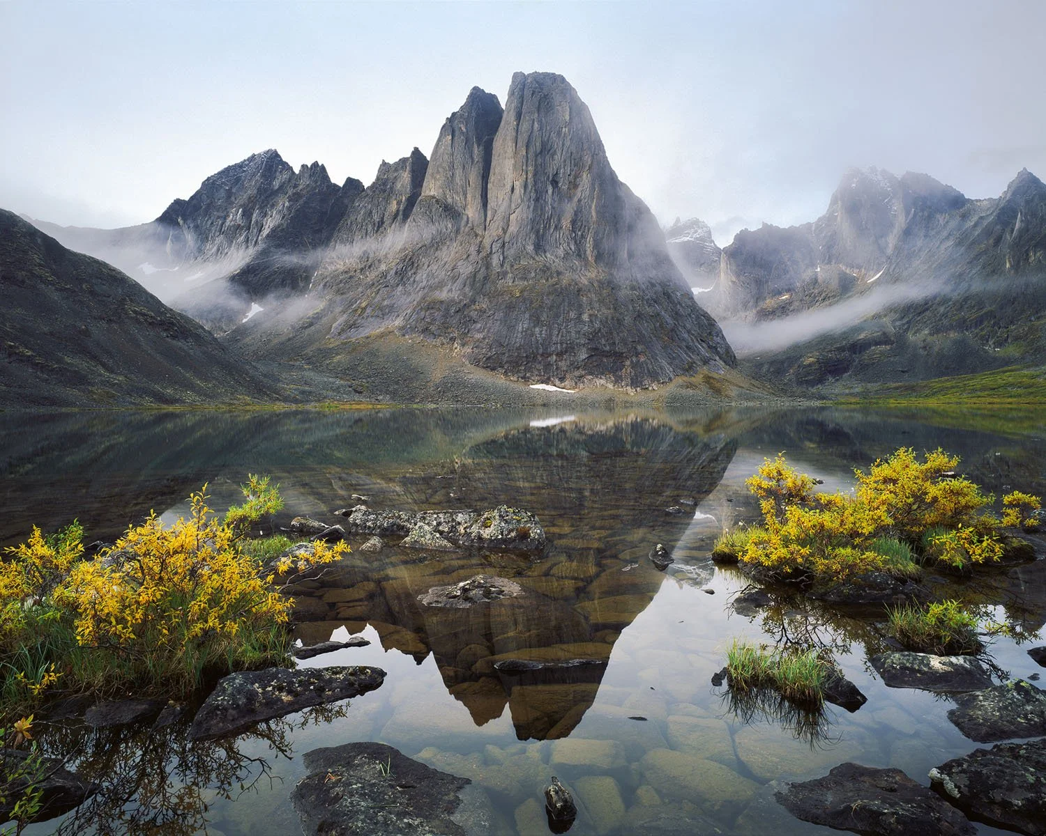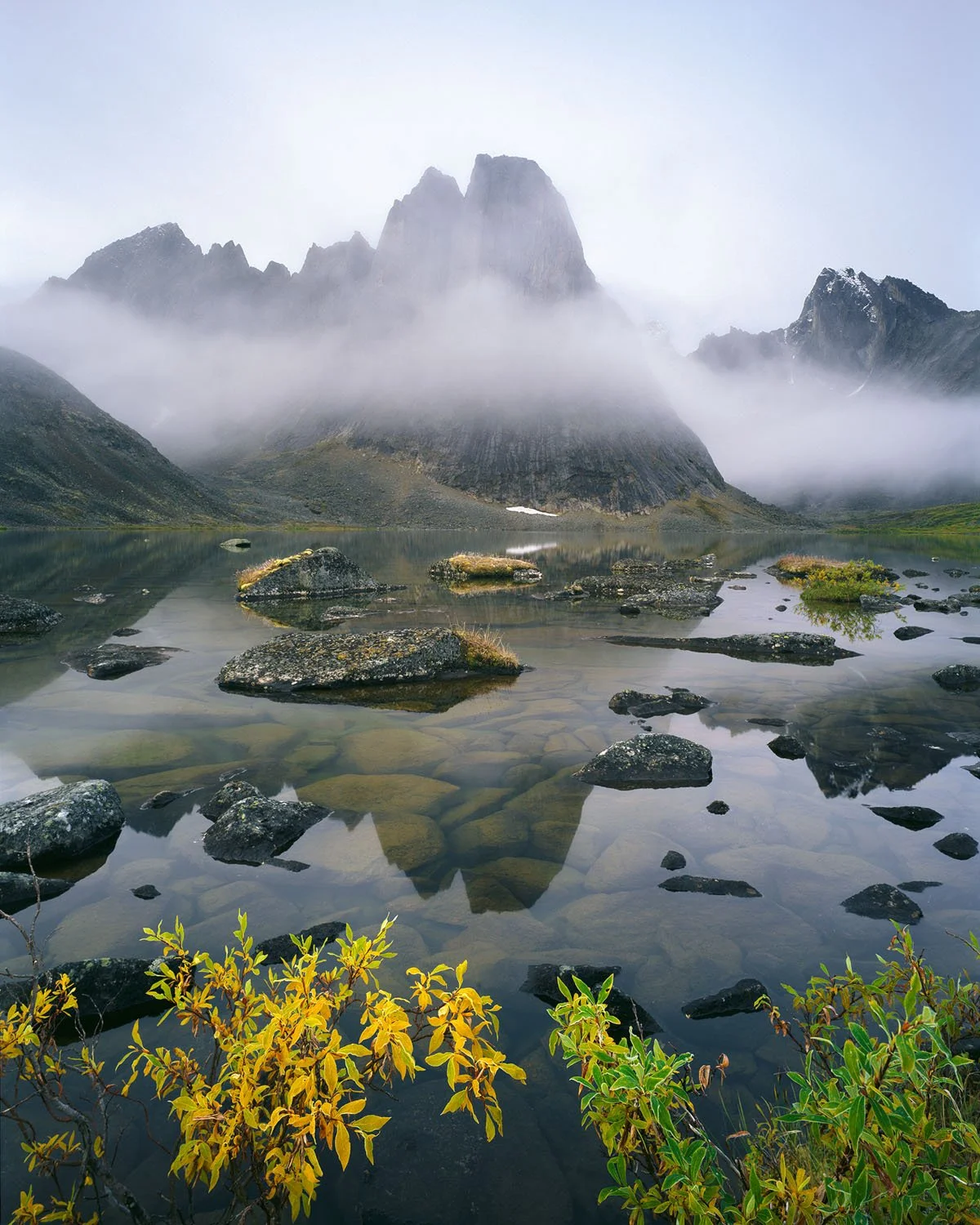 “Divide Lake Autumn” - Fog swirls around peaks, reflecting in perfectly calm waters. Tombstone Territorial Park, Yukon - September 2024. E100 4x5, 75mm lens, 1/8 second at f22, 812 filter. Prints available.