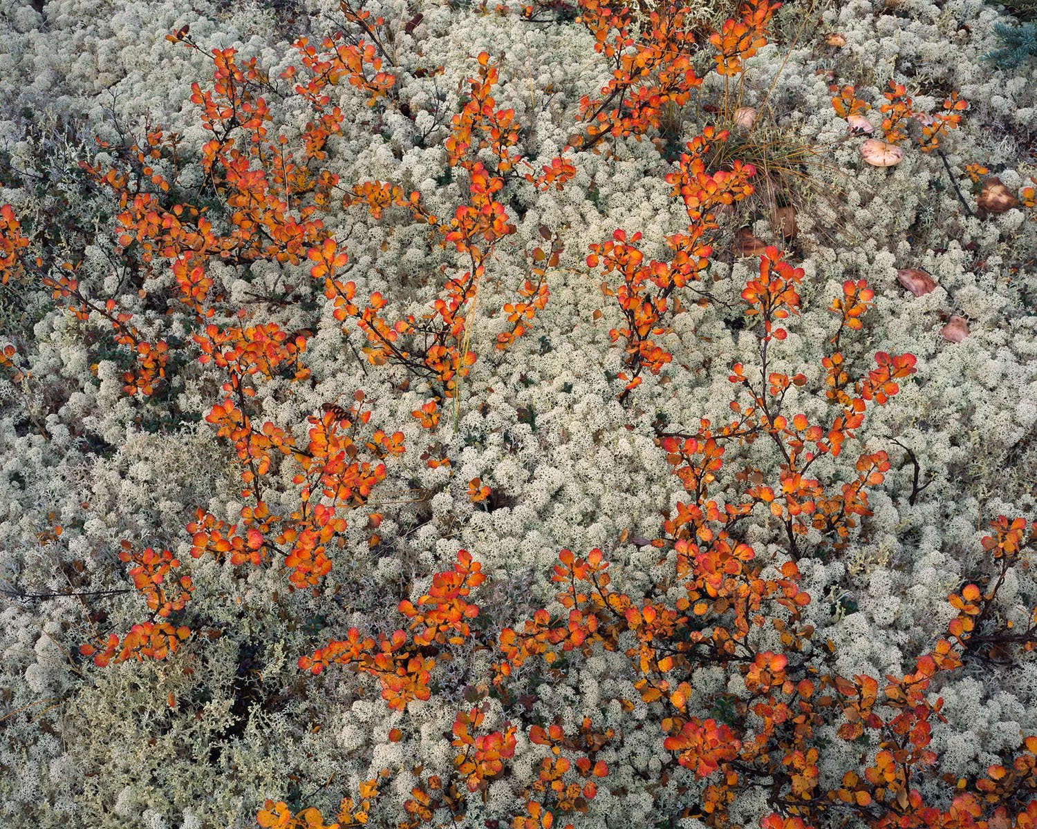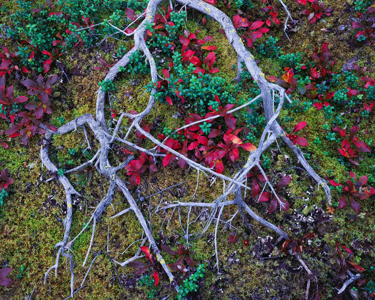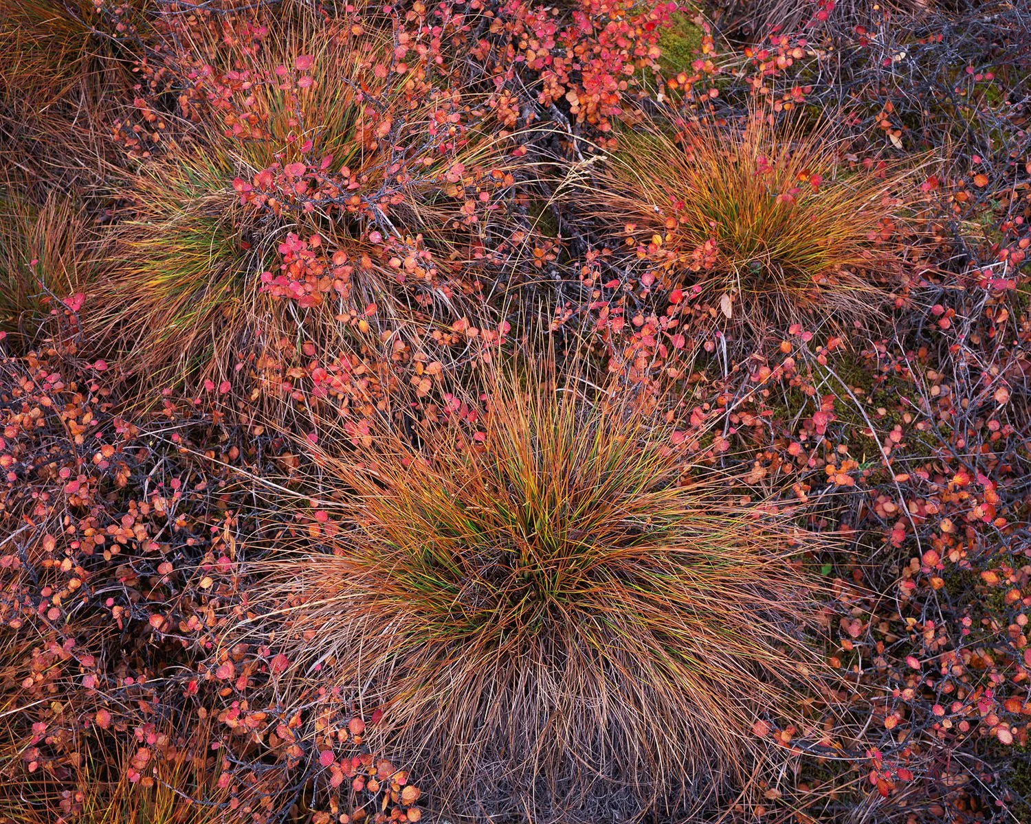There were some good chances to find solitude as well, especially with the two-night basecamp at Talus Lake. One of the days had marvelous weather, starting with clearing fog and eventually mostly sunny skies. I took the time to wander around the tundra landscape on my own, exploring some nearby lakes, streams, and endless autumn color. There’s such a unique smell to the far north in the autumn, something that happens around the patches of wild blueberry bushes and reindeer moss. The earthy and fruity aroma immediately took my mind back to the Alaska trip two years earlier, to the memories of the land near treeline in Denali National Park. I snacked on ripe blueberries as I hiked, easily picking them from the small bushes on the ground.