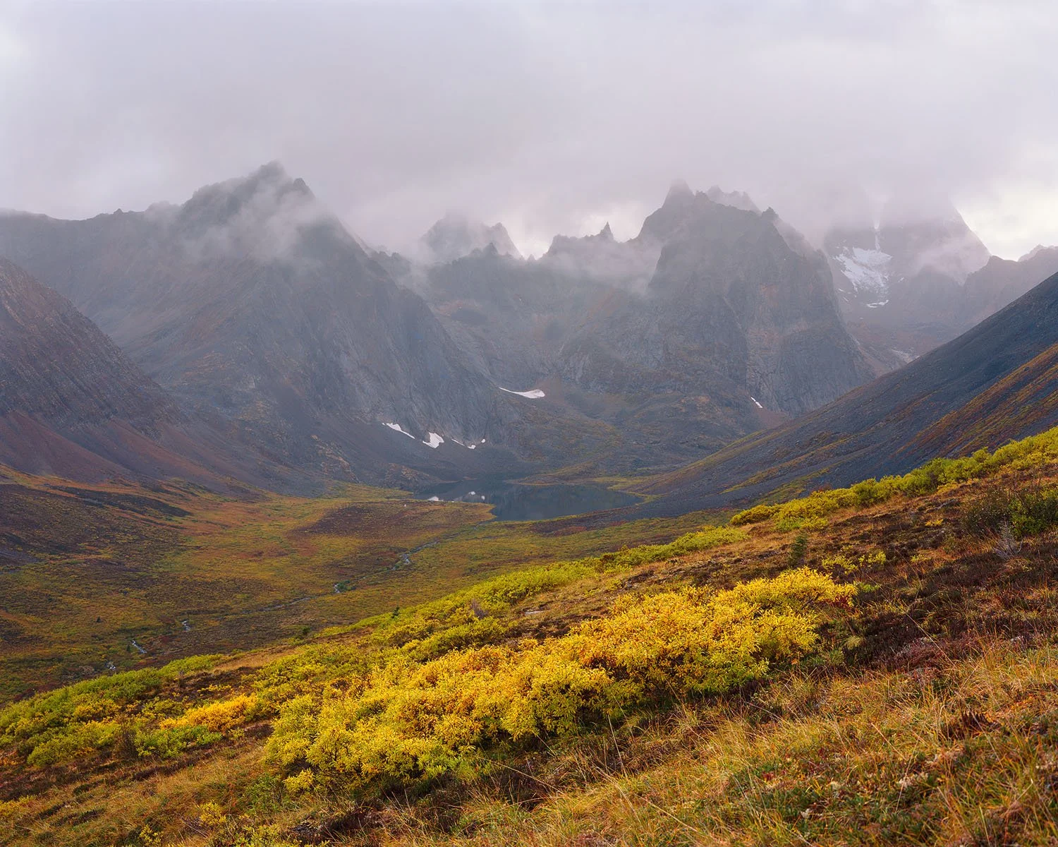 Using a 4x5 camera back here was the right call for me. There were some challenges with quickly moving fog and weather that meant I missed a few shots due to the slow setup, but overall I was able to take my time and get the most out of the big sheets of film. The weight of the pack was significant and the park-required bear can is never fun to fit into a backpack with large format gear. With cold weather gear, a week of food, and a three-lens large format kit I had a 100 liter backpack stuffed to the gills. The warm layers and waterproof boots were particularly important, as during the first week of September the temperature dipped below freezing each night as we awoke to frost every morning. Weather changed quickly from snow to spitting rain to sun and stiff breezes.