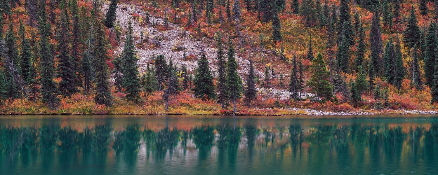 “Spruce Reflections” - A hillside of spruce and autumn bushes reflect in a pond. Northern Rockies, British Columbia - September 2024. Velvia 50 4x5, 300mm lens, 1/2 second at f22, no filters. Prints available.