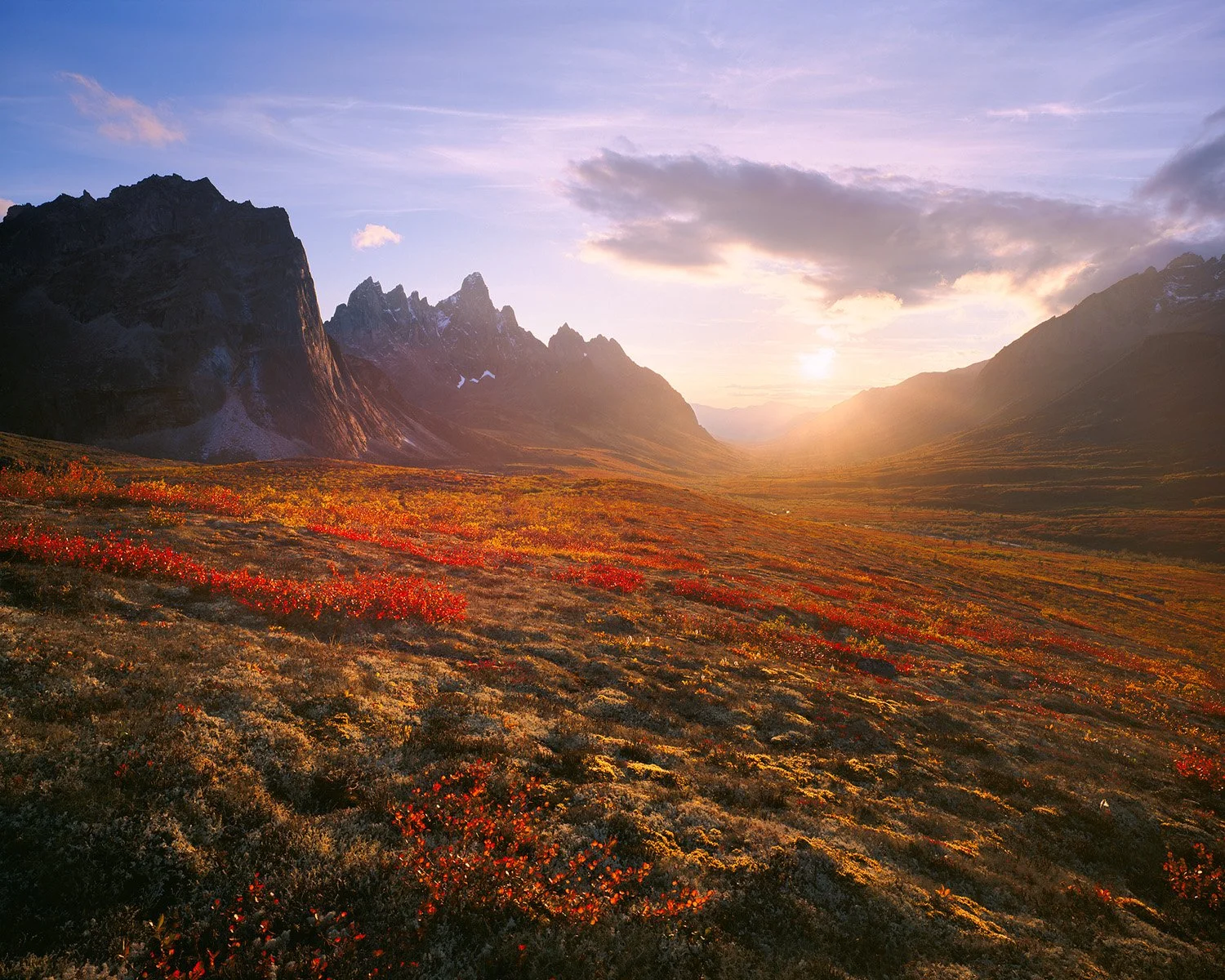 “Tombstone Sunset” - The sun sets in the valley beyond the Tombstone Range, with a carpet of autumn swamp birch covering the landscape in red. Tombstone Territorial Park, Yukon - September 2024. E100 4x5, 75mm lens, 1/4 second at f32, no filters. Prints available.
