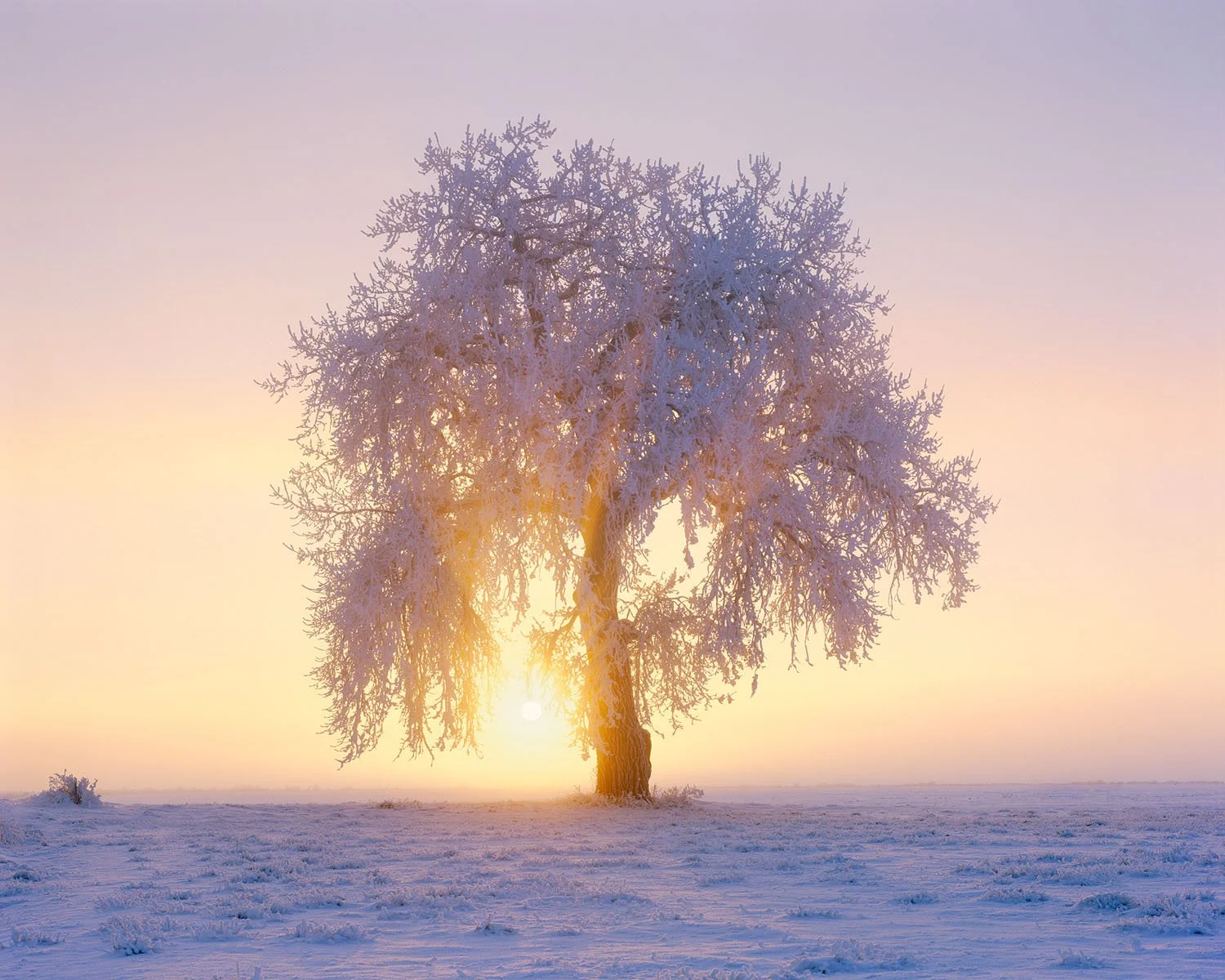 “Frosty Dawn” - Morning light through fog and frost, a lone cottonwood creates beams of light. Weld County, Colorado - January 2025. E100 4×5, 200mm lens, 1/2 second at f32, no filters.