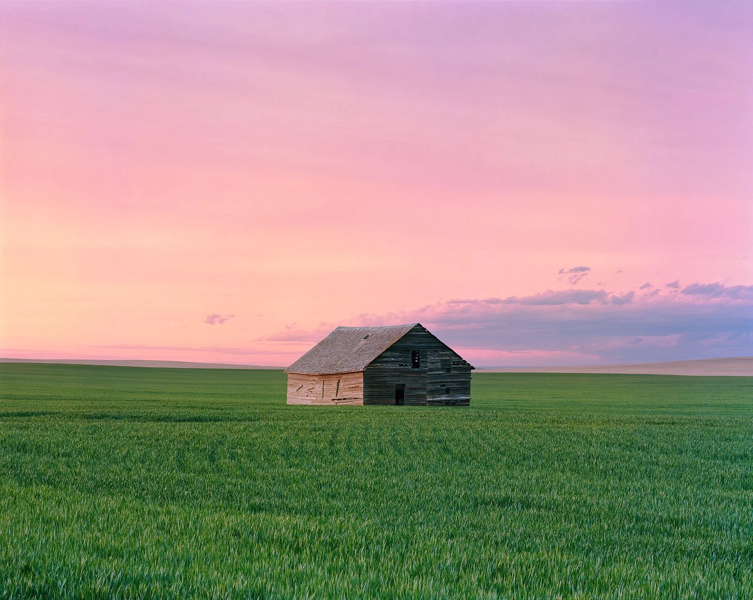 “Rudyard Barn” - A barn at sunset in a field of green wheat. Northern Montana - May 2025. Portra 160 4x5, 200mm lens, 10 seconds at f32, 2 stop soft GND filter.