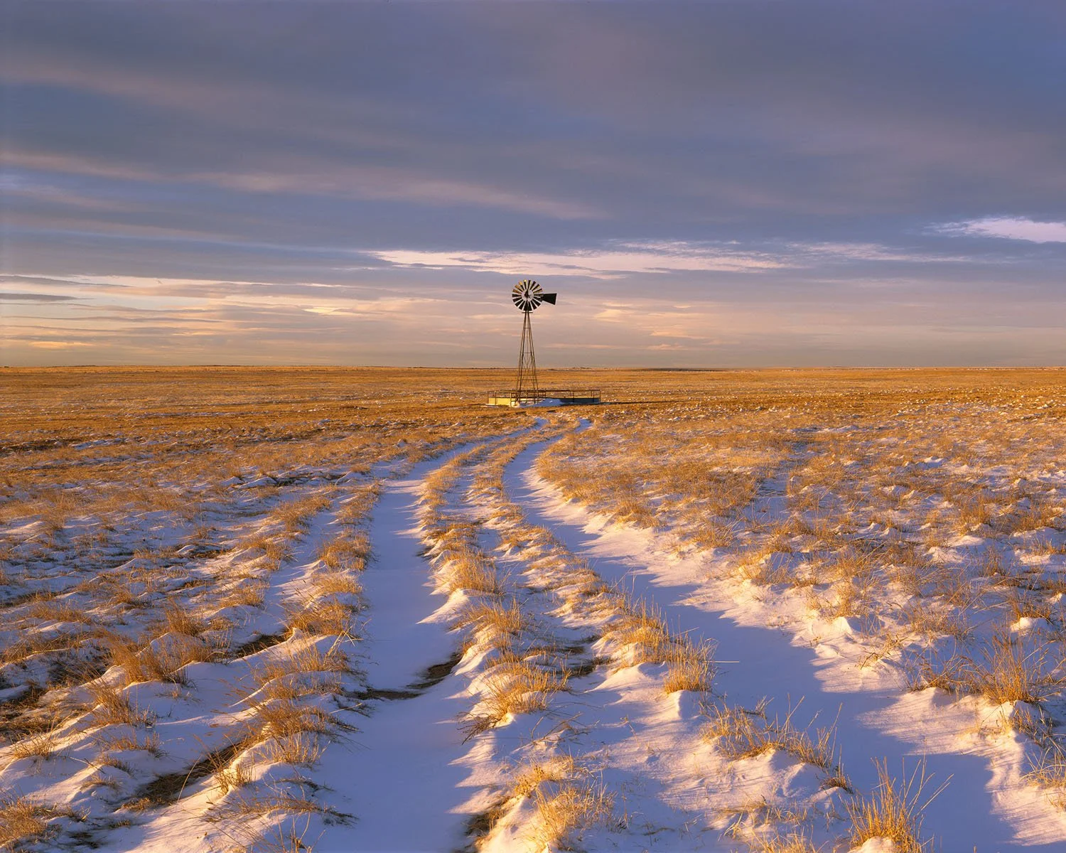 “Windmill Snow” - A windmill at sunset on the snow-covered prairie. Weld County, Colorado - January 2025. E100 4x5, 200mm lens, 1/2 second at f32, 812 filter.