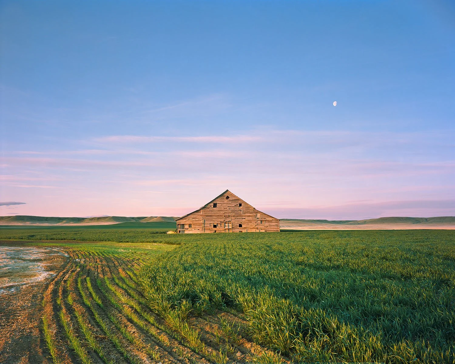 “Barn, Moon, Wheat” - First light on a spring-green wheat field and a large barn. Western Montana - May 2025. Portra 160 4×5, 125mm lens, 1 second at f32, 1 stop soft GND filter.